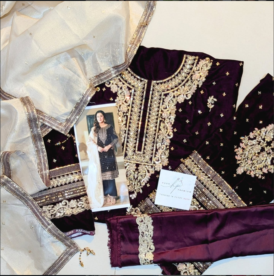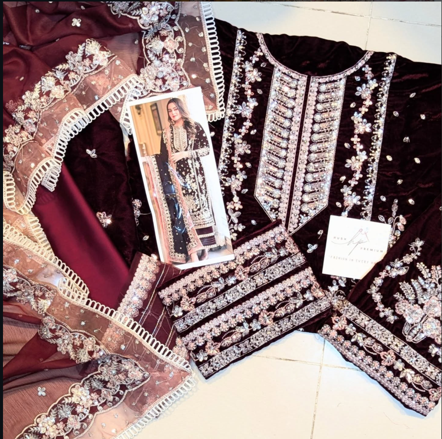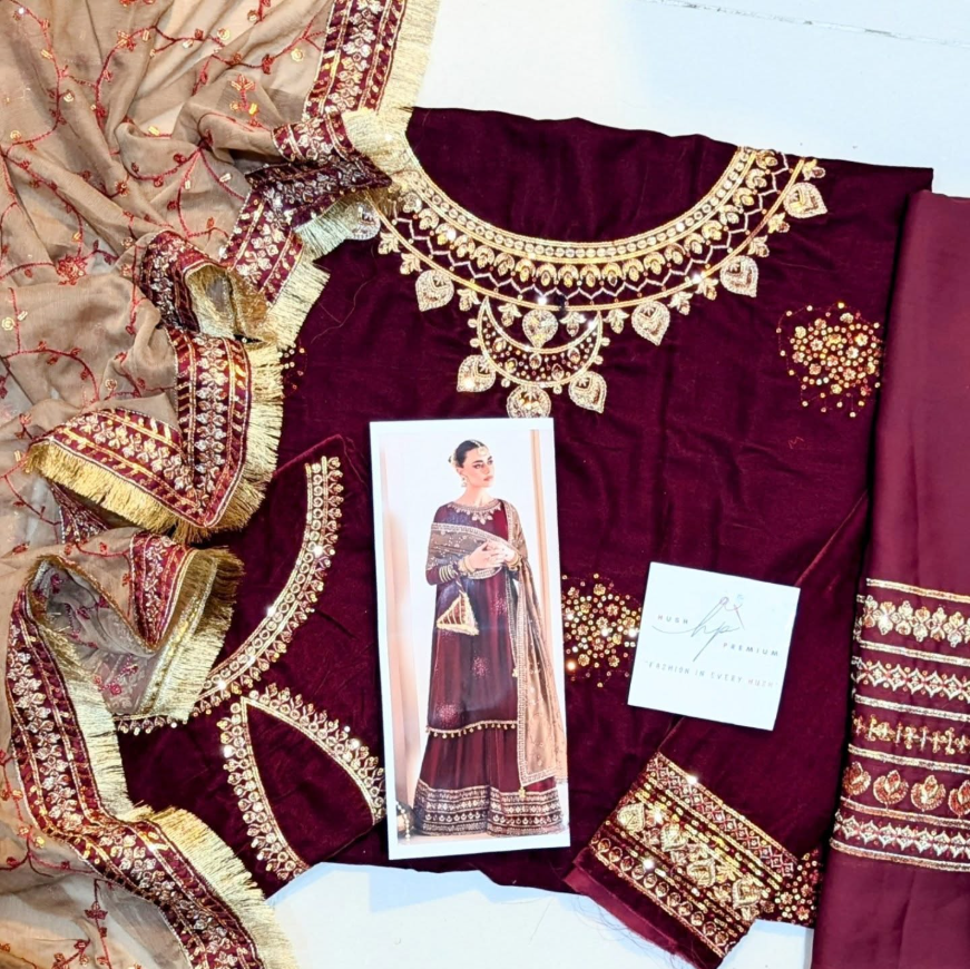 Turn heads this festive season with Aneela’s Maroon Velvet Party Wear – a statement of luxury, warmth, and timeless elegance.