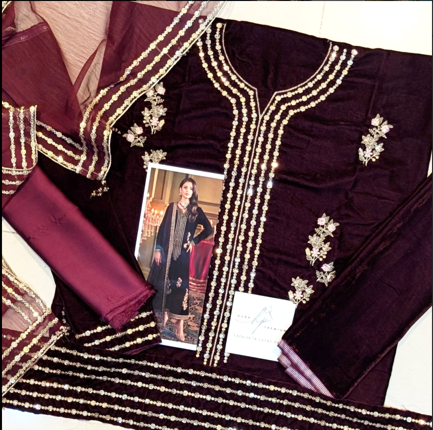 Turn heads this festive season with Aneela’s Maroon Velvet Party Wear – a statement of luxury, warmth, and timeless elegance.